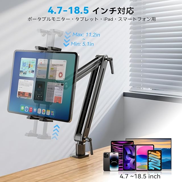 幅広い互換性:このスタンドは、ポータブルモニター、タブレット、iPad、スマートフォンなど、4.7~18.5インチのデバイスに対応しています。オフィス、自宅、外出先での使用に最適です。