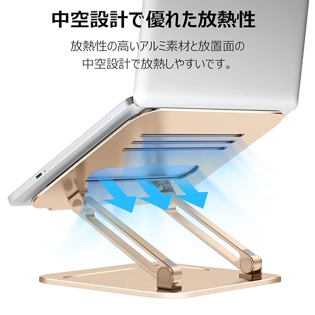【通風穴の設計&放熱性抜群】本ノートパソコンスタンドは熱伝導性が優れているアルミ合金製で、熱によるパソコンの動作自体が強制終了するトラブルを防ぐことができます。ノートパソコンとの接触面に通風穴を設けて、空気の流動性と放熱性を向上させているので、パソコンなどのデバイスの使用寿命を延ばし、ノートパソコンはより速く運行することができます。 夏場の熱暴走対策にも活躍します。