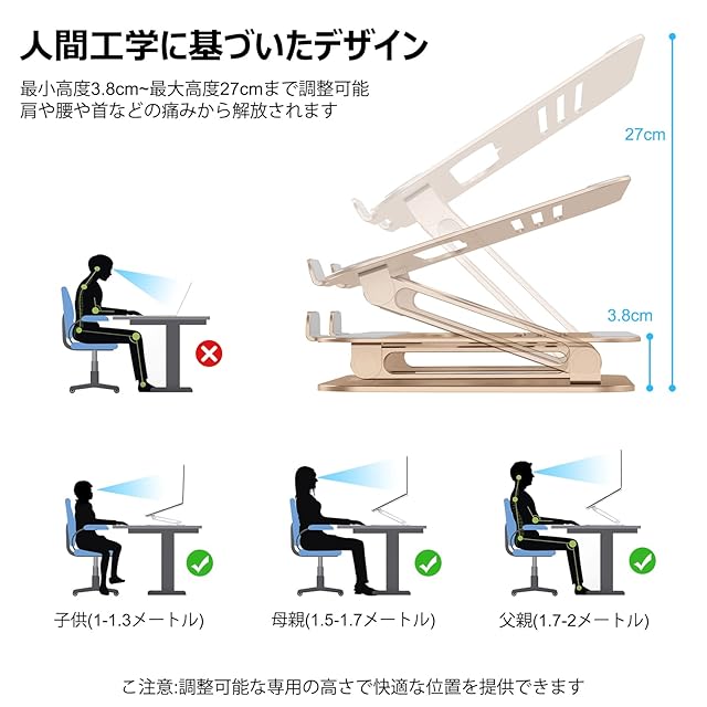 【無段階高さ調整可能】弊社のノートパソコンスタントは人間工学に基づいた設計により、高さを6~26cmまで調節できて、台座の傾斜角度も0~60°まで変えられますので、自身を合わせて最適な姿勢を整えて、首、肩、背中などへの負担が軽減されています。★回転軸部分は耐腐食性を高めるアルマイト処理で、摩擦に強く、角度や高さが自由自在に調整可能ですが安定感も抜群。★PC作業時に自分に合う高さや角度に調節するため、悪い姿勢になり身体になりがちです。一番気持ち良い姿勢を保ち、長時間のPC作業も苦にならず、集中力も高まり作業効率UP。