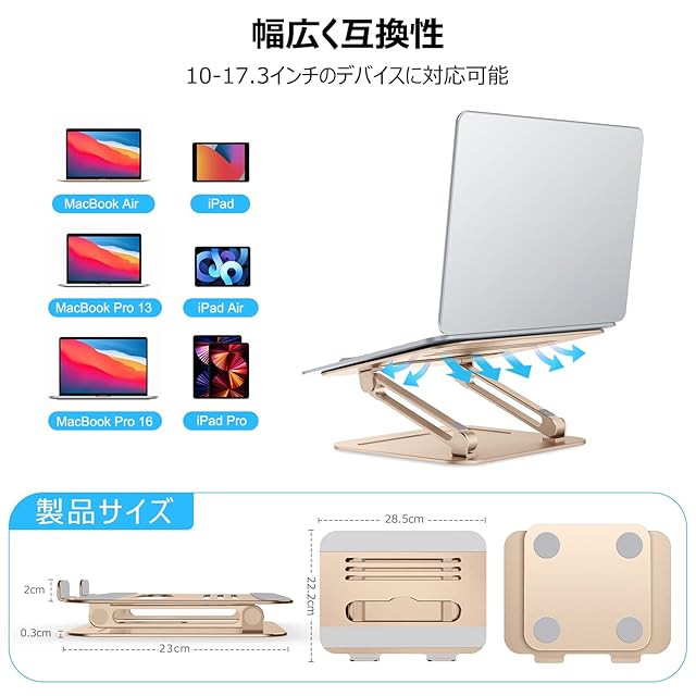 【優れた構造・幅広い対応機種】アルミ合金素材から全体的な構造まで、Z字型の設計でパソコンスタンドの下にかなりスペースがあり、有効に活用してキーボートやUSBハブ、鍵、ペンなどを収納できて、デスク周りをスッキリ整頓します。しかも、凹んだデザインで、ペンを置いても勝手に転がりません。どこに触れてもシルクのような滑らかな手触りと感じられます。Macbook/Macbook Air/ Macbook Proシリーズ/Surface/Surface Proシリーズ/Surface Book/iPad Pro/Sony/HPなどのすべての11-17.3のノートPCやタブレットを幅広くに対応可能です。