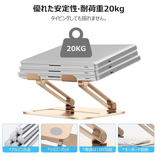 【耐重20kg・放熱性抜群】 両足構造で傾きがなく、デバイスをしっかり固定し、擦り傷から最大限度に保護できます。耐荷重は最大20kgまで、重いノートパソコンを乗せてもグラグラせず安定しています。高度と角度を調節する時には多少力が要りますが、成人女性でも問題ない程度です。逆に調節する時に力が必要があるため、タイピングしても、液タブに腕を乗せて描いても揺れません。冷却しやすいアルミ合金スタンドに美しさと耐久性を兼ね備えた隙間を設けて、熱伝導率の高いアルミニウム合金素材でしっかりとした作りながら、ノートパソコンスタンドの設置面に空いた通風穴で空気の流動性と放熱性を向上します。