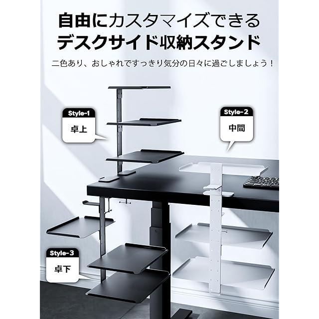 カスタマイズ3段階 収納トレイ: 棚板*3個、高さ自由調節ネジの穴があり、必要に応じてトレイとフックの方向と幅を自由に調整できます。特徴!!棚板のサイズは他の製品より大きい、他の製品よりも大きいサイズ、より厚い素材、そして圧倒的な耐荷重!デスク周りの様々なアイテムをもっと便利に収納できる、強靭で頼れるデスク収納トレイです。