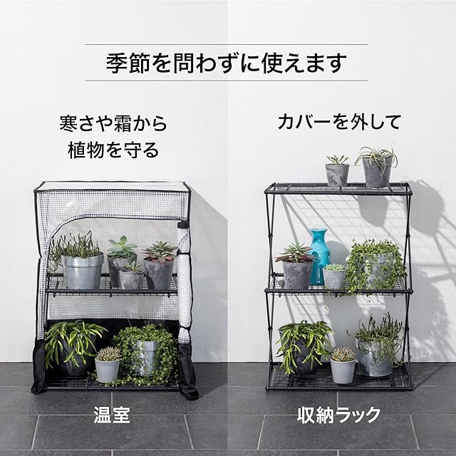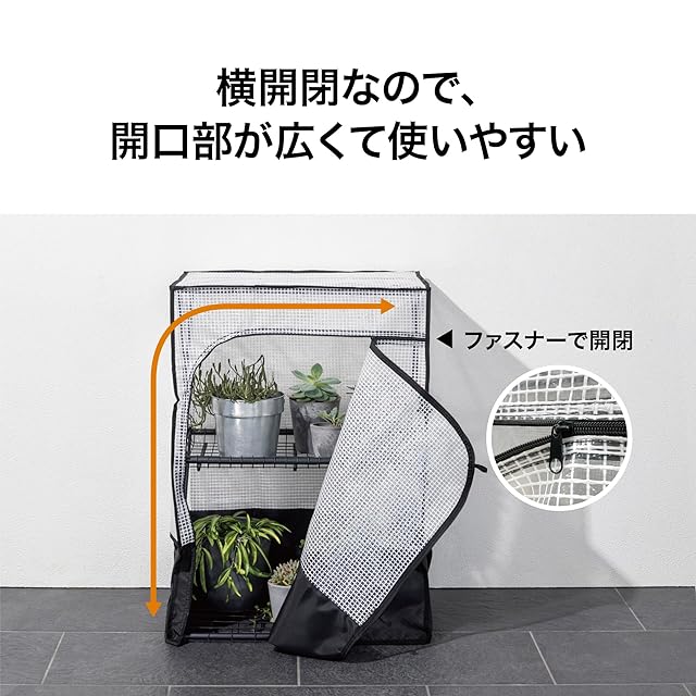 素材構造: 本体はスチール製で安定性を確保。カバーはポリエチレン・ポリエステル素材で植物を保護。