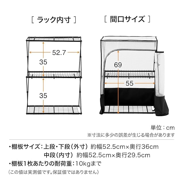 収納スペース: 上段・下段の棚板は幅52.5cm×奥行36cm、中段は幅52.5cm×奥行29.5cmの収納空間を確保。