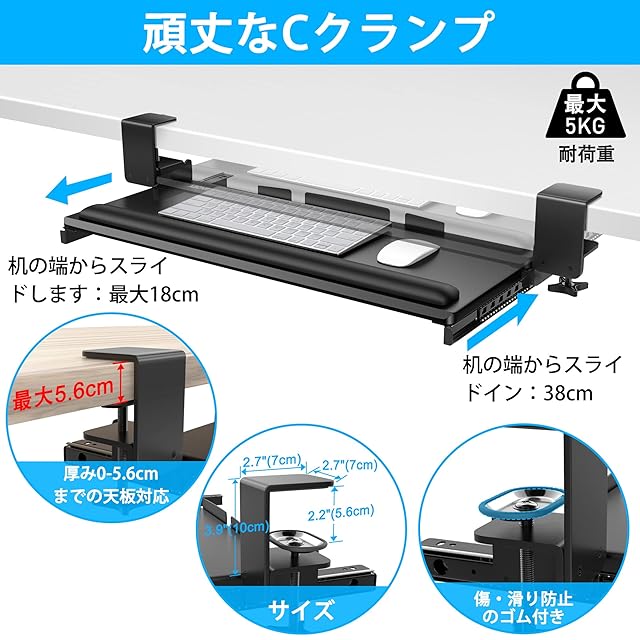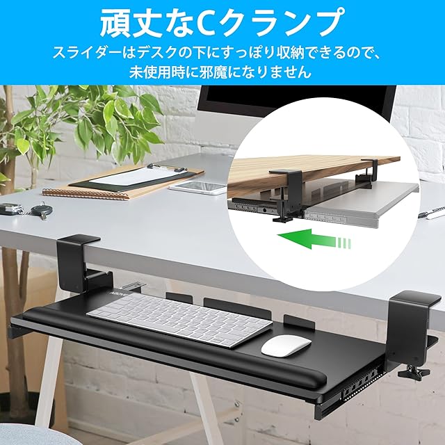 頑丈なCクランプ: 非常に頑丈なCクランプにより、デスクにダメージを与えることなくワークステーションにキーボードトレイを安全に取り付けます。このAboveTEK デスクキーボードトレイは、頑丈で肌に優しい滑り止めMDFボードで作られており、最大2.2インチの厚さのデスクにフィットするよう拡張できる頑丈なクランプを備えています。