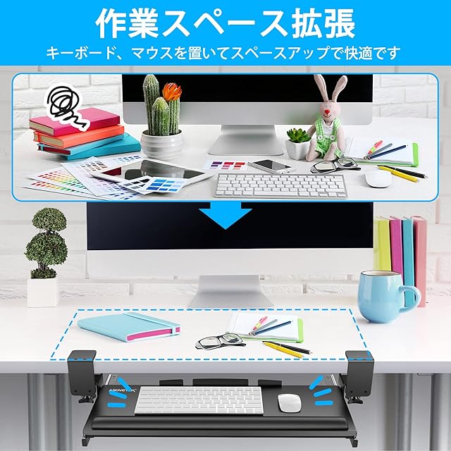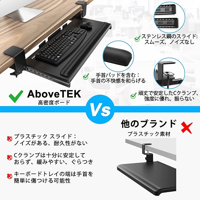 AboveTEK 大型キーボードスライダー 後付け キーボードスタンド リストレスト付き 頑丈なCクランプ式 キーボードトレイ デスクエクステンダー 肘置き台 デスク延長板 手首パッド 人間工学に基づいたデスクコンピュータ キーボード 台 キーボード デスク拡張 マウス収納可能 取り付けが簡単-黒