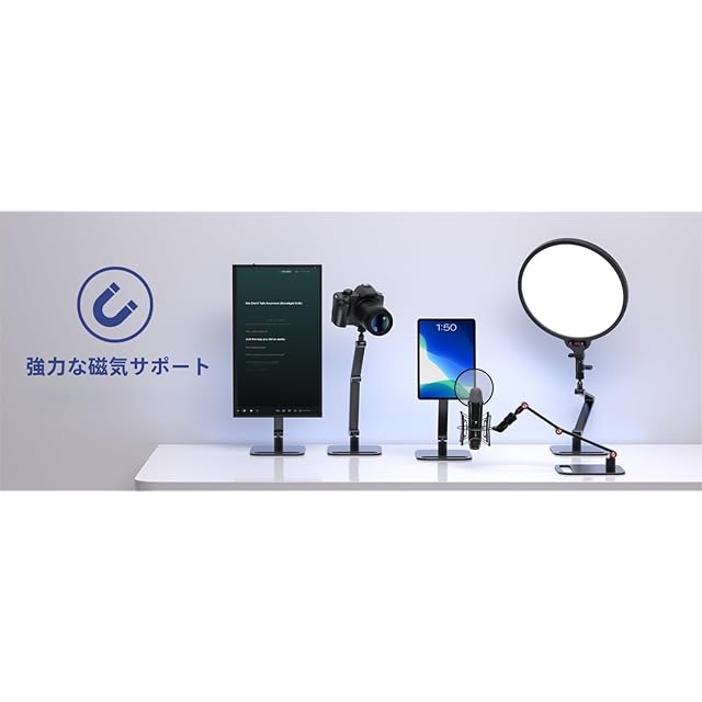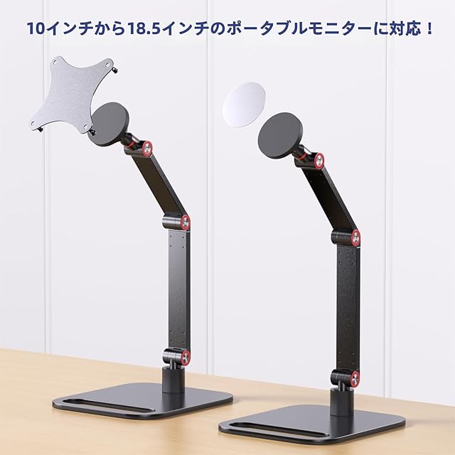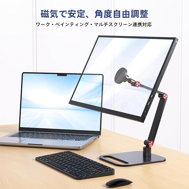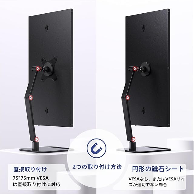 【磁気吸着式取り付け|VESA75*75対応・ポータブルモニターも対応】 VESA75*75 マウント対応の磁気吸着設計で、10〜18.5 インチ(25.4cm〜47cm)までのモニター・タブレット・ポータブルモニター(10 型 / 10.1 型 / 11 型など16種類のサイズ)を確実に固定します。スケッチ・デザイン、映画鑑賞など、多様な使用シーンで安定した操作性・表示環境を提供します。
