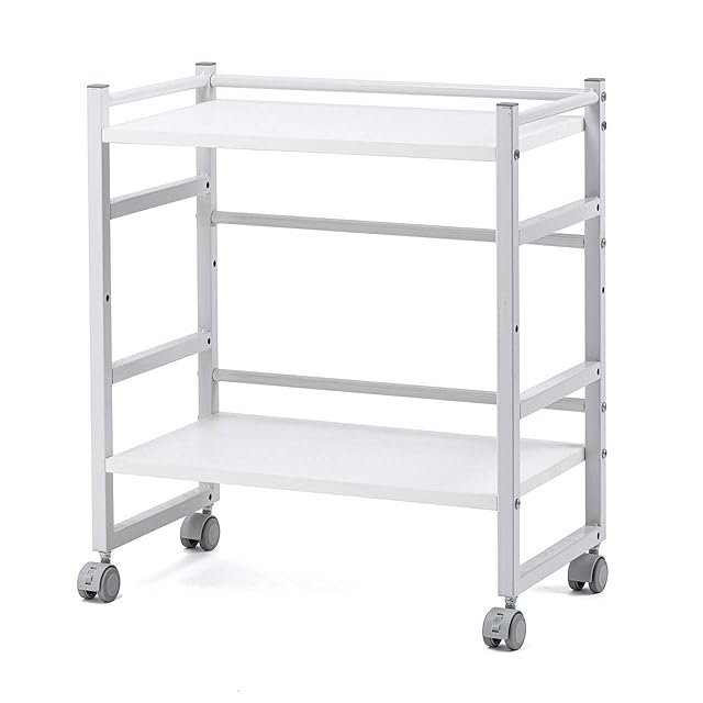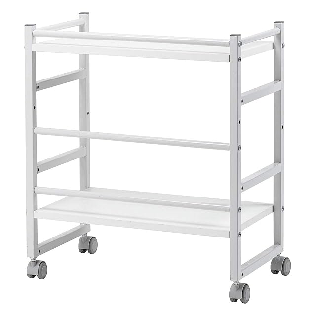 2枚の棚板を取り付ける場所は、3箇所から選択でき収納する物に合わせて調整できます。キャスターが付いているのでちょっとした移動にも便利です。