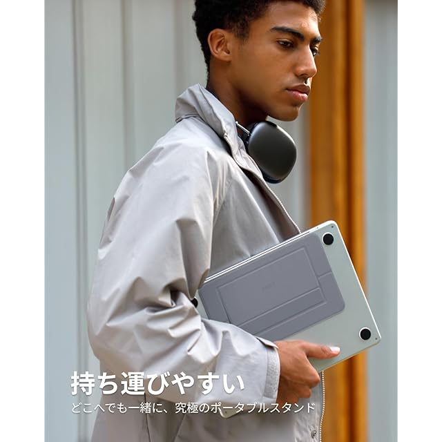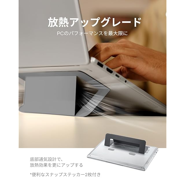 【シンプルで効率的・変わらぬサポート】特殊なPU素材を使用し、思い通りに動く折りたたみ式デザインを採用し、軽量・小型・薄型でありながら、最大耐荷重5kgの日常使いのできるパソコンスタンドです。 *ご注意:パソコンスタンドをご使用の際、キーボードの周りを叩くとパソコンが揺れるという意見を頂きました。この件について、実際に使用した場合を検討し、作業時両手を自然にキーボード上に置くと揺れることはないのでご安心ください。