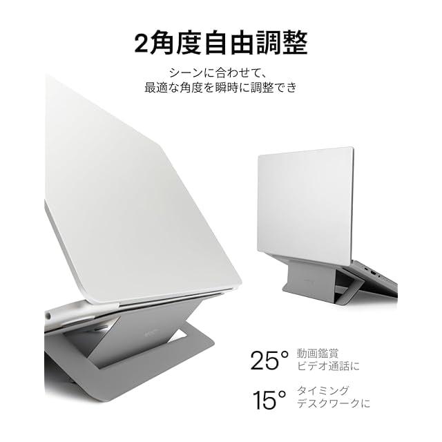 【折り畳み式・2段階調整】MOFT Airflow Standは、MOFT歴代のパソコンスタンドのデザインを踏襲し、一秒開きで15°& 25°二段階の角度があらゆるシーンで調整可能、快適な使用角度を提供し、仕事の効率を向上させることができます。