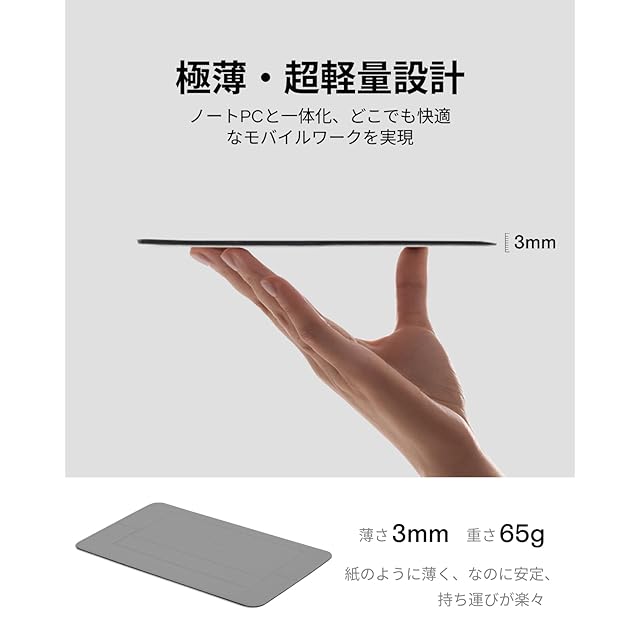 【驚きの軽さ· ミニマリズムへのこだわり】重さわずか65g,サイズは約224*135*2.5mm。AirFlow Standは薄さ・軽さの限界に挑み、レギュラーサイズを20%削減し、25%以上の軽量化を実現した製品です。 さらに、収納時はスタンドをしっかり固定できるように、スナップシール2枚付属しており、まさに見えない収納を実現しています。