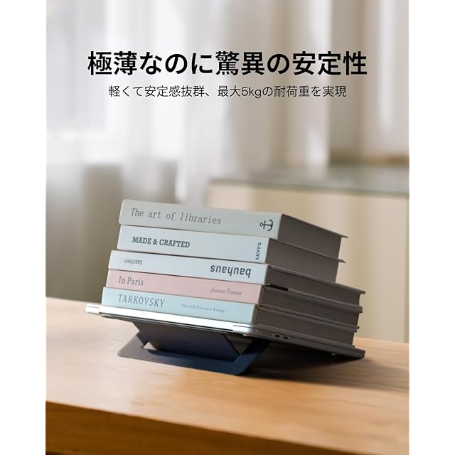 【シンプルで効率的・変わらぬサポート】特殊なPU素材を使用し、思い通りに動く折りたたみ式デザインを採用し、軽量・小型・薄型でありながら、最大耐荷重5kgの日常使いのできるパソコンスタンドです。 *ご注意:パソコンスタンドをご使用の際、キーボードの周りを叩くとパソコンが揺れるという意見を頂きました。この件について、実際に使用した場合を検討し、作業時両手を自然にキーボード上に置くと揺れることはないのでご安心ください。