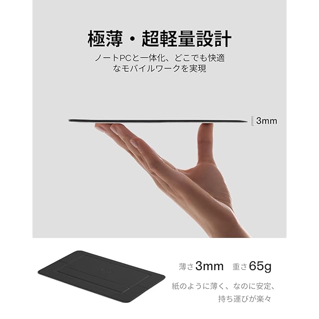 【驚きの軽さ· ミニマリズムへのこだわり】重さわずか65g,サイズは約224*135*2.5mm。AirFlow Standは薄さ・軽さの限界に挑み、レギュラーサイズを20%削減し、25%以上の軽量化を実現した製品です。 さらに、収納時はスタンドをしっかり固定できるように、スナップシール2枚付属しており、まさに見えない収納を実現しています。