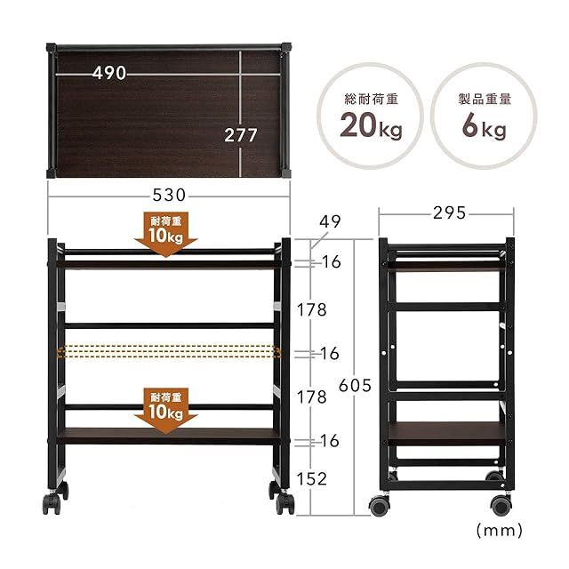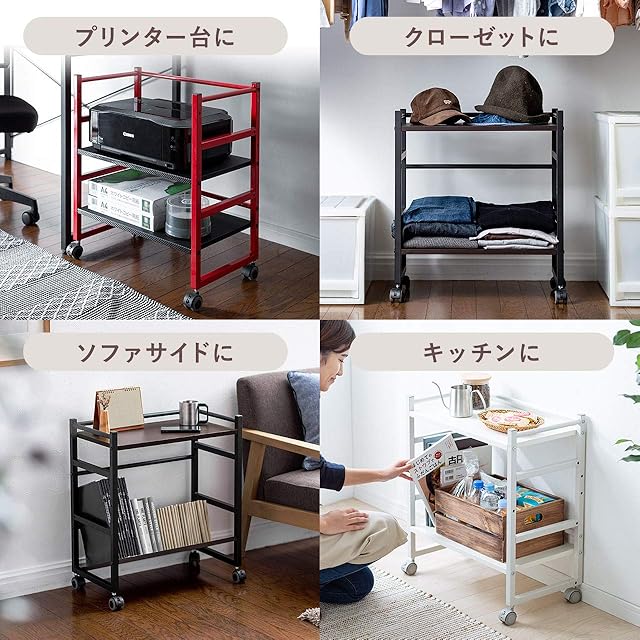 汚れに強いメラミン化粧板を使用し、落下防止バーで収納物が落ちにくいです。プリンター台としてや、クローゼット・押入れの整理用、ソファサイドラックとしても使用可能です。