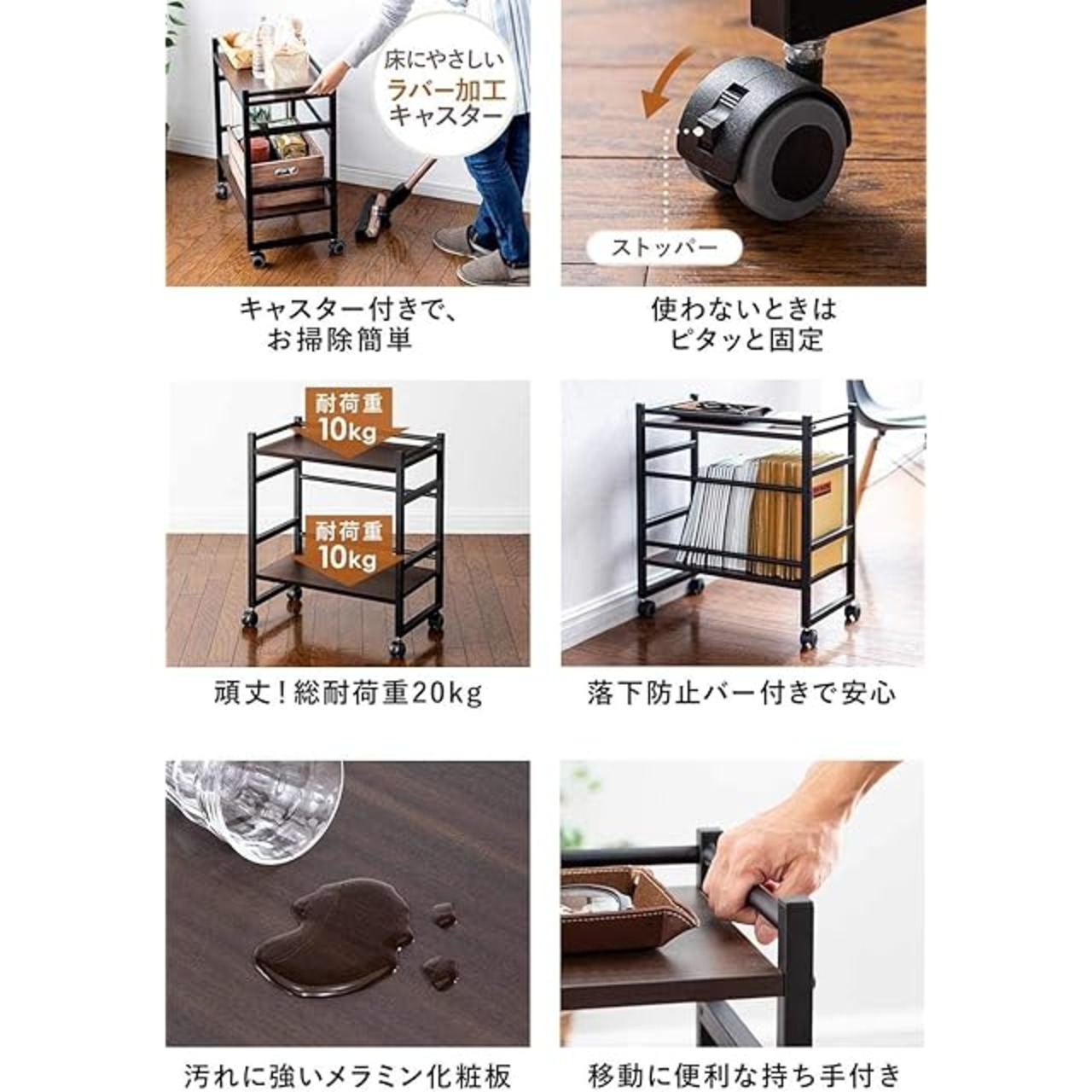 前側2個のキャスターにはストッパー付きです。総耐荷重は20kgで、書類や小物、プリンターなども設置可能です。