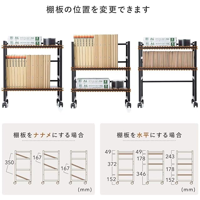 2枚の棚板を取り付ける場所は、3箇所から選択でき収納する物に合わせて調整できます。キャスターが付いているのでちょっとした移動にも便利です。
