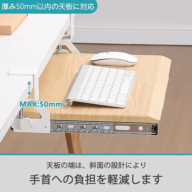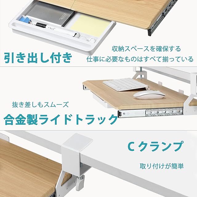 【スライドスムーズに】 合金製のスライドラックにより、抜き差しもスムーズに行えて、機能性も抜群です。キーボードトレイは机の端から220mm伸長します。使用しないときはテーブルの下に簡単に収納できます。作業効率を向上させながらも、姿勢を正すことで操作がしやすく、長時間の作業が快適になります。