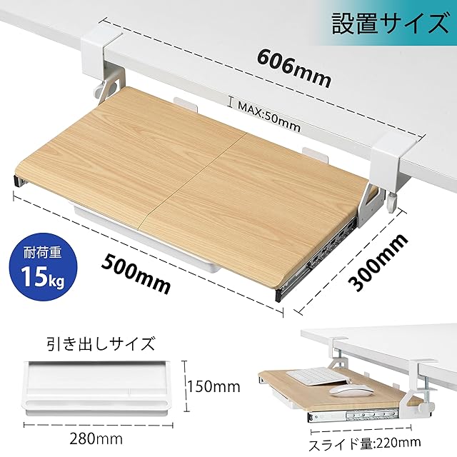 【製品仕様】幅500mm(クランプを含めて606mm) x 奥行き300mm 材質:パーチクルボード(メラミン化粧板) 耐荷重15KG ※耐荷重は測定値であり、値ではありません。