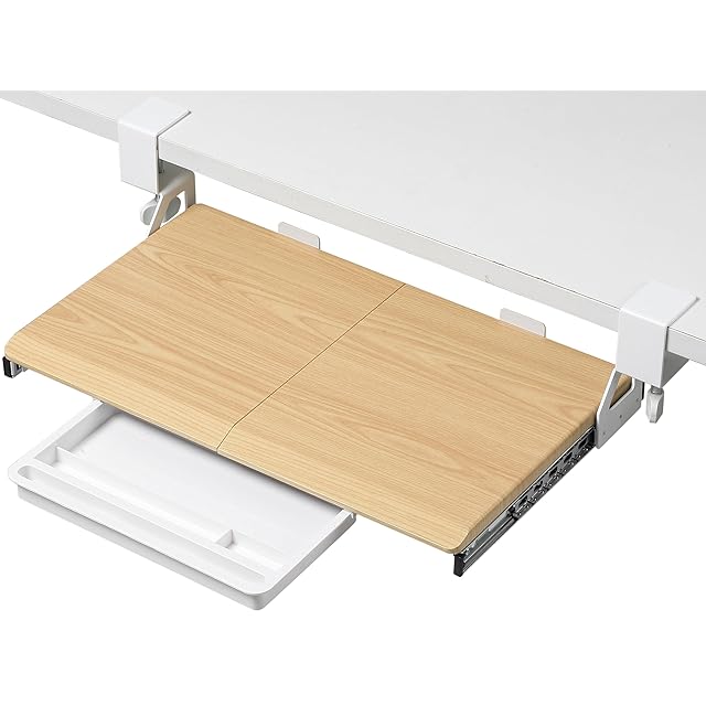 ETHU 後付けキーボードトレイ キーボードスライダー クランク式 幅500*奥300mm 天板2枚接ぎ スライドスムーズに 人間工学 姿勢改善 ペンケース付き メープル
