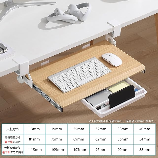 【収納力アップ】キーボードやマウスを置いていたスペースを別の作業に使えるので、効率がアップします。三つの引き出しを装備しています。(仕様:281x158x290mm、217x110x320mm)文房具や散らばる小物を収納できで、デスクトップスペースを充実させ、煩雑さを減らす。スライダーはストッパー付きデザインで、キーボードが落下して破損することを防ぎます。
