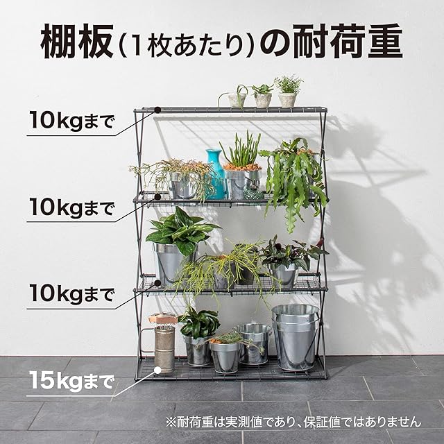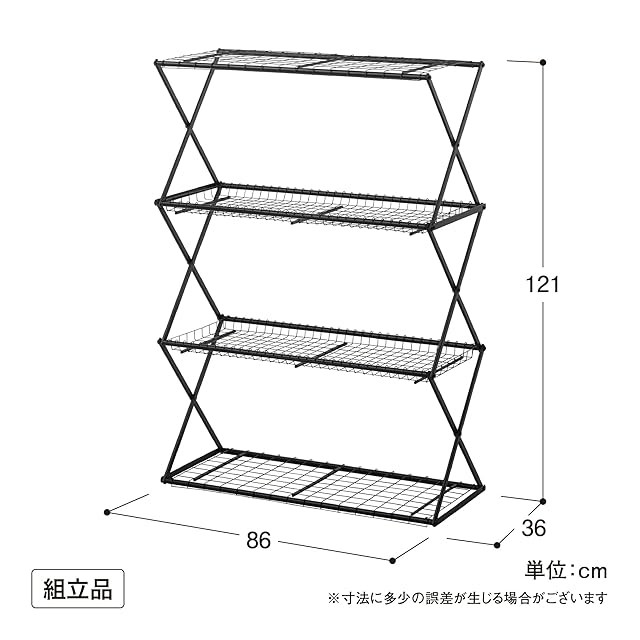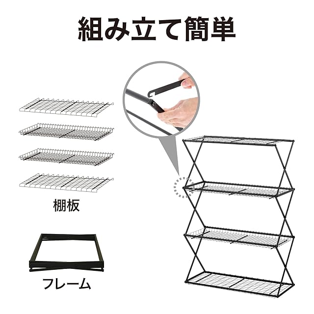 組み立て簡単で、伸ばして広げ、棚板を置けばもう完成。誰でも簡単に設置できる折りたたみタイプで組み立てに工具は使いません。