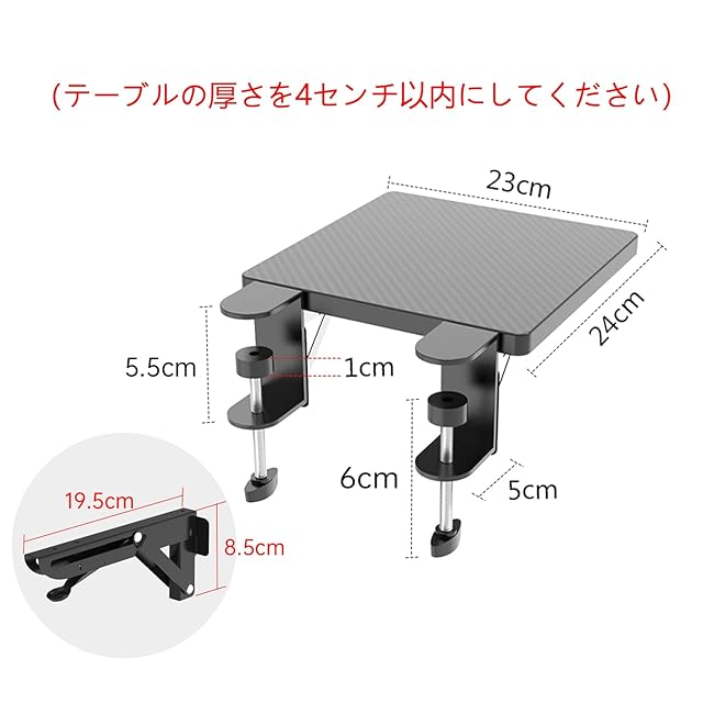 【Cクランプ式·穴あけ不要】デスクエクステンダーは、厚さ4cmまでのデスクに取り付け可能な調節可能なダブルCクランプが特徴です。鋳鉄製K型クランプ設計を採用し、4cmのデスク厚制限によりクランプの安定性を確保します。厚みが大きすぎると、クランプの耐久性が低下する可能性があります。また、外側の拡張トレイは安全性を考慮した丸みを帯びたデザインで、耐摩耗性の防水表面により、お手入れが簡単です。