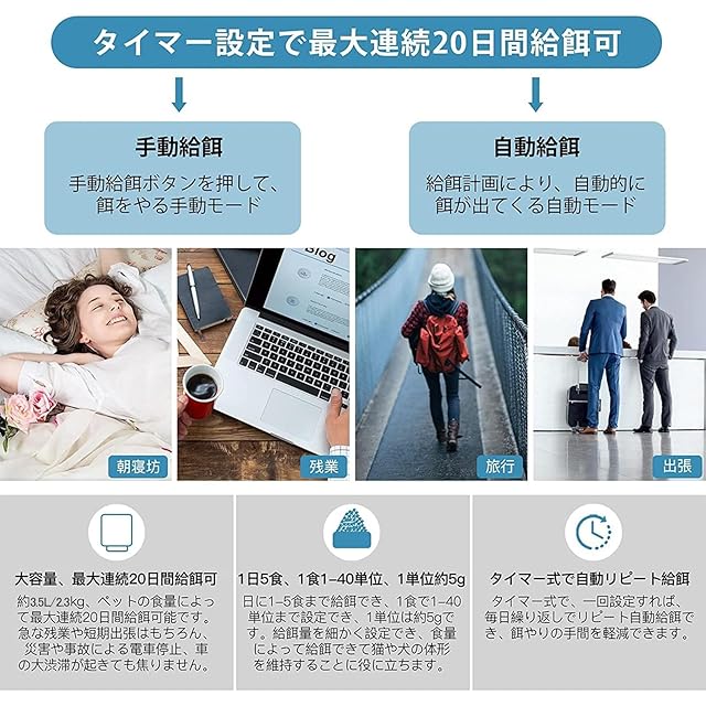 ✅【3.5L大容量最大連続20日間給餌可】 約3.5L/2.3kg、ペットの食量によって最大連続20日間給餌可能です。