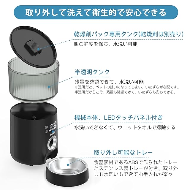 ✅【ステンレス製皿、取り外して水洗い可】 ➤食品級ABS材質とステンレス製皿を採用し、衛生的で安全です。 ➤ペットの食事と健康を守るために、このペットフードオートフィーダーは蓋、フードタンク、フードトレーもステインレス製トレイも水洗い可能になりました。(ご注意:本体は水洗いできなくて、汚れたらウェットタオルで拭いてください。)