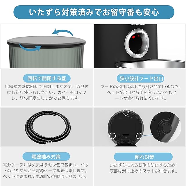 ✅【12ヶ月、いたづら防止】 ➤ 電線噛み付き対策-同梱される2mの噛み防止チューブで、噛みちぎりによる感電事故などを防止します。 ➤お買い上げ日より、1年の安心を提供いたします。万が一の場合は、お気軽に出品者までご連絡ください。 ➤フードの出口は狭小に設計されているので、ペットが出口から手を突っ込んでもフードが食べられる心配もありません。 ➤倒れる対策-ペットのいたずらを防止し、底部は滑り止めのマットが付きます。