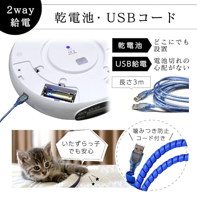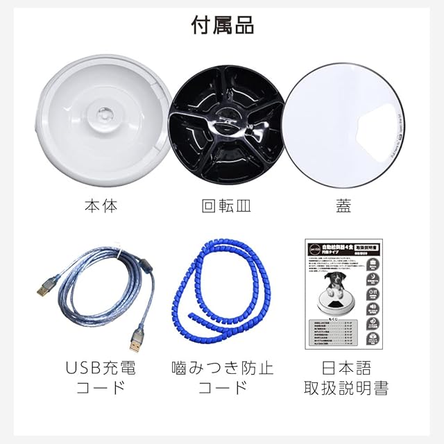 商品仕様<br> 容量:96g×4食 重量:1.4kg サイズ:約33cm×32cm×8cm USBケーブル付き(噛みきり防止部品付き)電池:単1アルカリ乾電池×3本(別売り