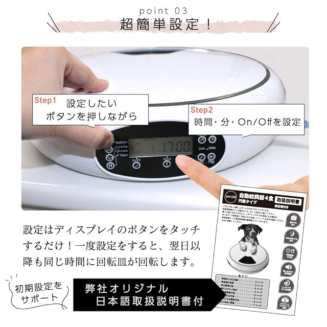 ※本体のリセットに関してですが現在の仕様ではリセット機能はございません。 取扱説明書記載事項と変更されておりますので予めご了承ください。 ※給餌器内時間は電波時計ではないため若干ずれることが考えられます。 ※ご使用の前に付属の取り扱い説明書を熟読し、 商品の知識、注意事項について習熟してから正しくご使用ください。