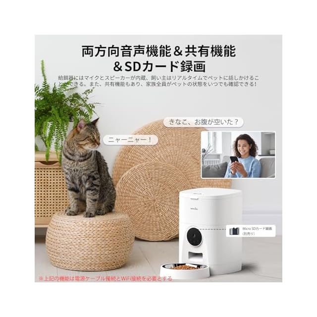 【取り付けしやすい】アプリでフードの時間と量を設定でき、自宅を離れている時でも管理できる。取扱説明書付きで、シンプルな操作で取り付けとメンテナンスができる。フードコンテナは取り外しできるので掃除と補充がしやすい。