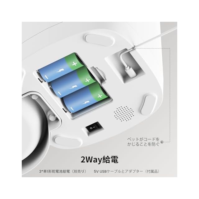【低消費電力・2Way給電設計】省エネ設計の餌やり機。付属の電源コードと電源アダプターを使用することで、少ない電力でスムーズに動作する。単1形乾電池3本(別売)でも給電可能。※電池は付属なし。停電時に備えて、両方の給電方法を併用することができる。節電と使いやすさの両方を兼ね備えたデザイン。