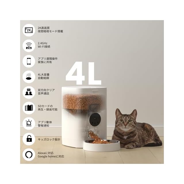 【大容量・自動給餌】ほとんどのドライフードタイプのキャットフードやドッグフードに対応できる4L大容量。中小型犬・猫・うさぎなら約2-3週間分のフードを収納可能!急な残業や出張、旅行でも家を空ける日々、ペットの食事を心配する必要はない!スマホでWansview Cloudアプリを使用して、1日1-5回の自動給餌が可能。毎回1-10のポーションを設定でき、手動給餌もワンタッチ。子犬・子猫の小分け給餌や、ダイエット中の量調節にもぴったり!ペットの食事量や食事時間を手軽に調整でき、アプリで給餌記録がメモされる。フード残量が不足してきたら、アプリでお知らせ。忙しい毎日でもペットの食事管理ができ、愛犬・愛猫の健康を、24時間見守る。(※本製品は2.4GHz帯Wi-Fiのみ対応、ご購入前にお使いの環境をご確認ください。)