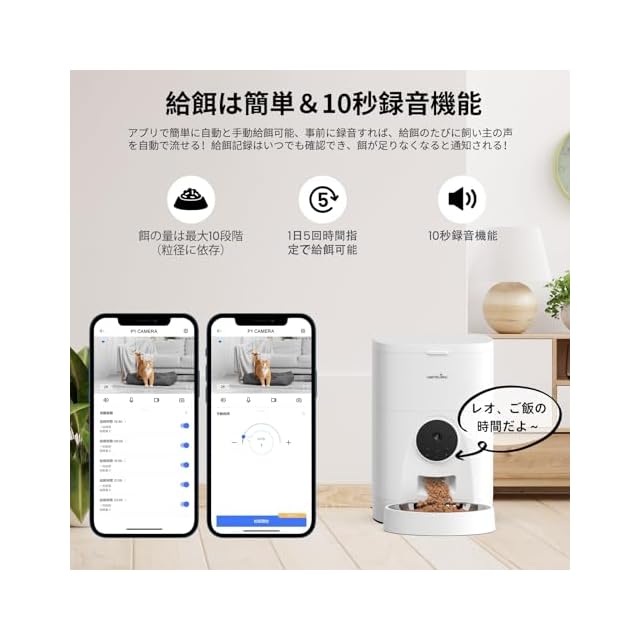 【食事のための呼び出し録音機能】10秒の録音機能で、給餌時に飼い主の声が自動的に再生できる。飼い主が近くにいなくても、ペットが飼い主の声を聞いて落ち着いて食事を楽しめるようサポート。
