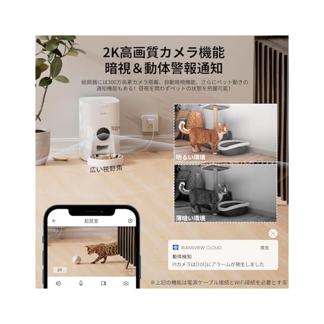 【多機能カメラ搭載】2K高解像度の300万画素カメラを搭載。1080Pよりも高精細な映像で、昼夜を問わず、明瞭でクリアにペットの様子を把握できる。2.4ghz帯Wi-Fi接続でWansview Cloudアプリから、リアルタイムでペットの映像を視聴し、呼びかけられる。共有機能を使用して家族みんなでペットを見守ることができる。アプリからペットの餌やりに関する通知を受け取ることも可能。