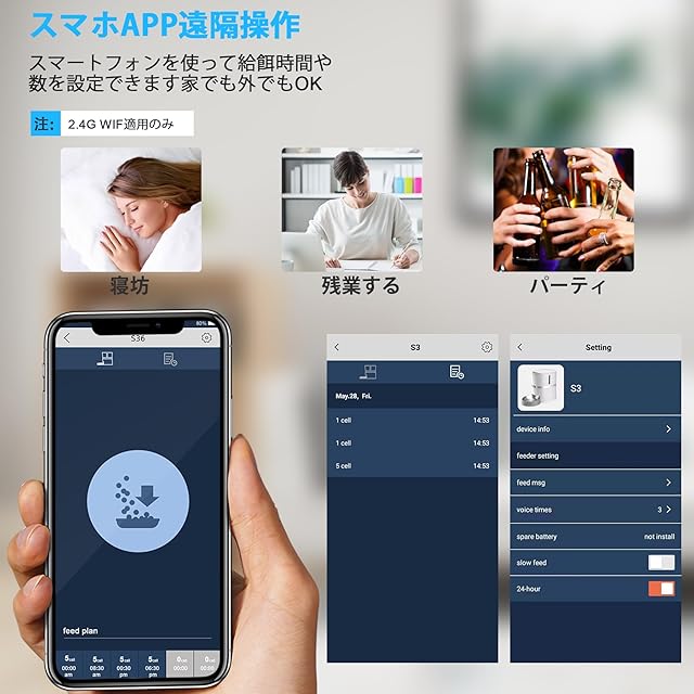 【APPリモコン】自動給餌器は2.4GHz WiFiを使用しており、接続が成功すると、出張や旅行中にいつでも給餌器を変更して管理できます。 このアプリは各給餌の時間と量を記録し、ペットの健康な給餌状態を分析するために使用できます。猫自動給餌器は1日6食まで設定でき、各食事の量は0〜48回まで設定でき、1ポーションは約6g。 給餌スケジュールを設定すると、停電や停電が発生した場合でも、自動給餌器は前のスケジュールに従って動作します。