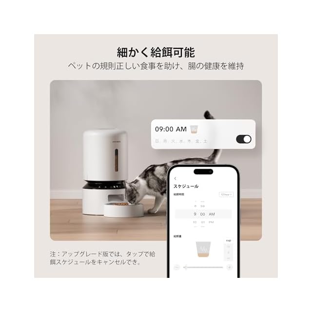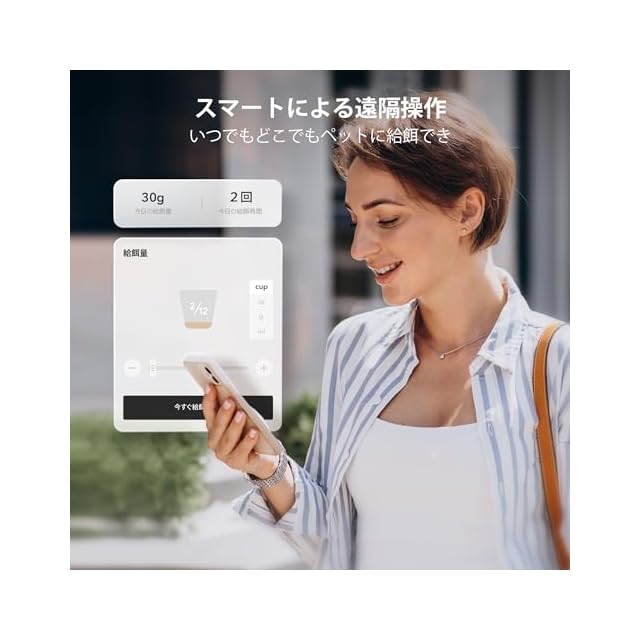 【設定とおり給餌】1日は1-10回の給餌設定が可能!給餌量は毎回で1-50のポーション(1ポーションあたり約20ml)を設定。ペットの体調に合わせて食事スケジュールを簡単にカスタマイズ。急なお出かけ、残業等で帰宅が遅くなったり忙しい時にあなたの代わりにペットをお世話。規則正しい時間に、少量ずつ、小分けに与えられる設定に、ペットの肥満、朝の空腹による嘔吐を防止できます。