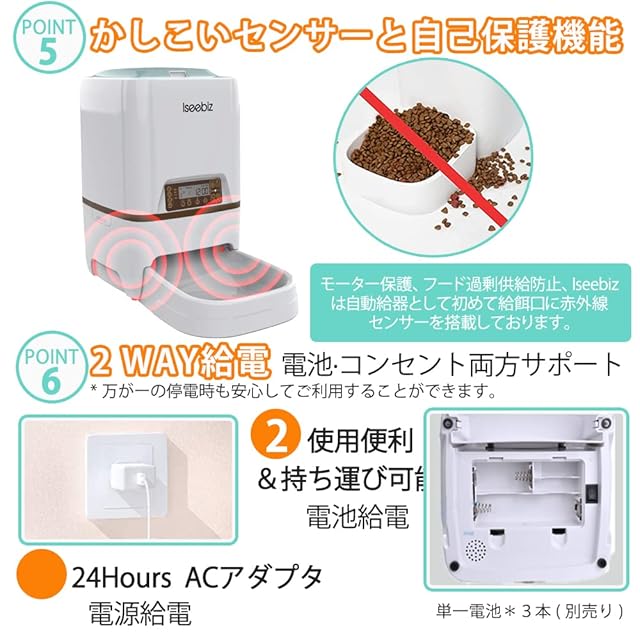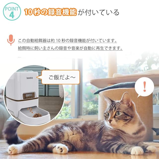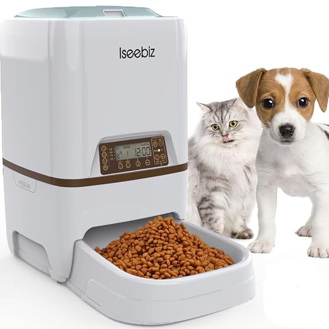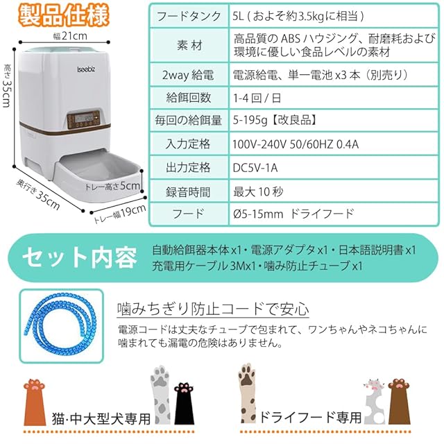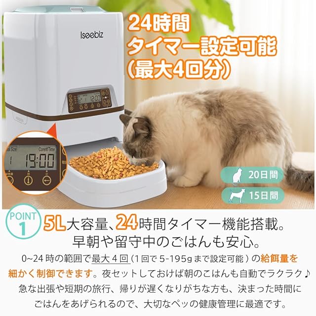Iseebiz 自動給餌器 猫 犬用ペット自動餌やり機 5L大容量 1日4食で最大20日連続自動給餌 タイマー式 録音可 水洗い可能 猫/犬/うさぎなど対応 留守も安心ペットフードオートフィーダー 日本語説明書付 ホワイト