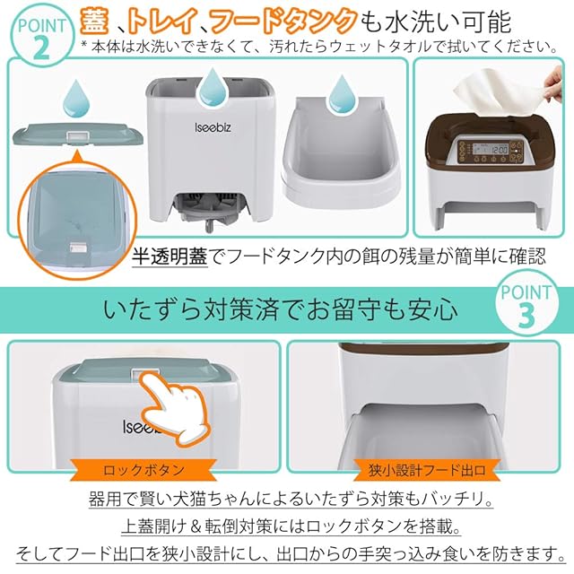 【水洗い可能】ペットの食事と健康を守るために、最新版のこの自動給餌器は蓋、フードタンクもトレイも水洗い可能になりました。本体は水洗いできなくて、汚れたらウェットタオルで拭いてください。衛生のために、一か月おきに掃除してください。★そして、半透明蓋で蓋を開けなくても簡単にフード残量が一目で確認できます。