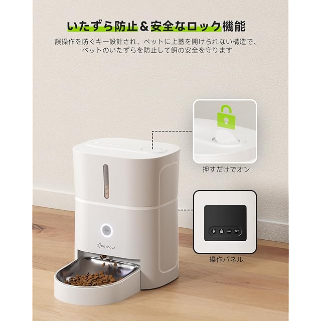 【餌詰まり防止&いたずら防止設計】二つ回転軸設計で、餌を出すことがスムーズになり、餌の詰まりの問題を効果的に防止します。また、操作パネルは裏面に設置されています。誤操作を防ぐキー設計され、ペットに上蓋を開けられない構造で、ペットのいたずらを防止して餌の安全を守ります。さらに、本体の正面に一つのボタンが設置し、ボタンを押すだけで1回給餌できますが、設定された給餌プランに影響なし。