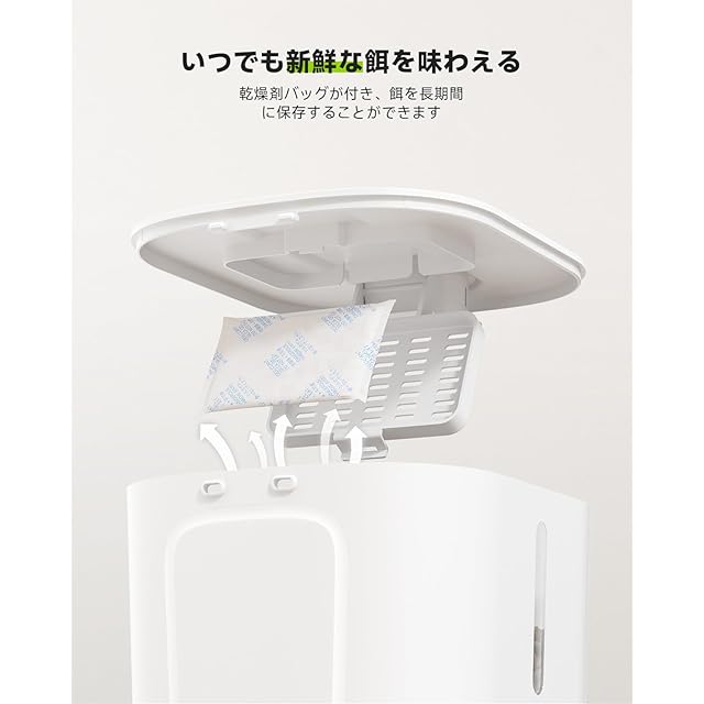 【おいしさ長持ちな食に】猫餌やり機は、フードタンクの入口から注ぎ口まで、外気に触れにくい密閉構造になっており、湿気や虫の侵入をしっかりブロック。さらに、蓋の裏側に乾燥剤をセットすることで、フードの劣化を防ぎ、常に新鮮でおいしい状態を保ちます。