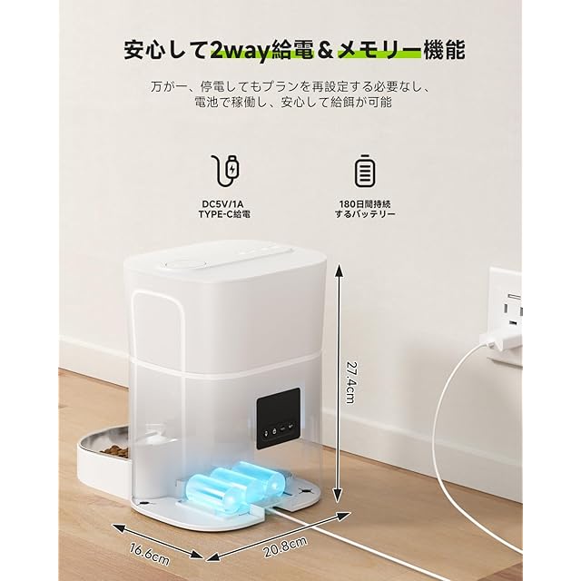 【2WAY給電&停電も安心】自動給餌器犬用はACアダプターと3本単1形乾電池(別売り)の二つの給電モードがあります。設定メモリを搭載しているので、電源を切っても給餌の設定を保存できます。万が一、走り回ってコードが抜けてしまったり、停電によって電源アダプターから給電できない場合は電池から給電され、災害時にも安心してご使用いただけます。
