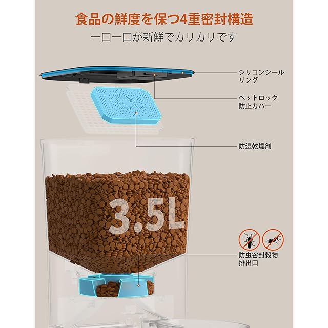 【食品の鮮度を確保】自動給餌器猫は給餌が完了するたびに給餌口を自動的に閉じ、昆虫が侵入したり、ペットが追加の餌を得るためにフードディスペンサーに忍び込んだりするのを防ぎます。自動フィーダーには乾燥剤とシールストリップが内蔵されており、食品を新鮮でサクサクに保ちます。食品グレードのステンレス製ボウルは、顎ニキビの心配がなく、ペットに清潔で健康的な食事を提供します。