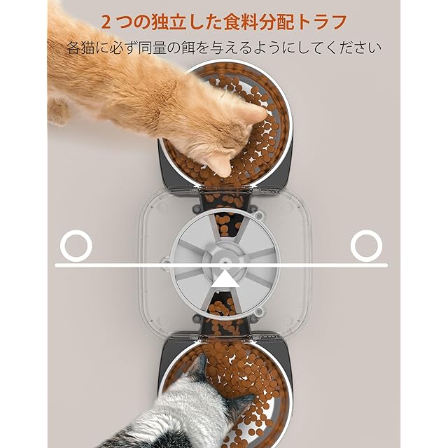 【両側に均等に餌を分配】従来の二槽自動餌やり機は単一の出口から餌を分配するため、餌の分配が偏りがちでした。 HONEYGUARDIAN 2匹用猫自動給餌器を使用すると、ペットフードを両側に同時に均等に給餌できるため、給餌の偏りを効果的に回避できます。また、左右の給餌設計により、ペットが食べ物を奪い合うことを心配する必要がなくなります。