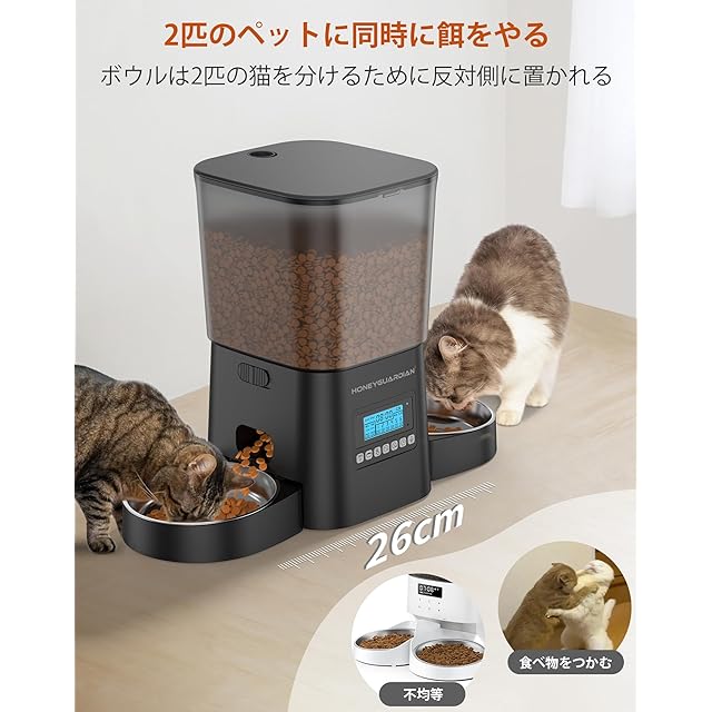 HONEYGUARDIAN 自動給餌器 猫 犬 2匹 タイマー式 3.5L容量 定時定量 1日6食 猫 餌 自動 2個のステンレスボウル付き 猫 中小型犬用 自動餌遣り機 複数の鮮度保持 水洗い可能 音声録音 手動給餌 緊急電源 詰まり防止センサー 日本語対応説明書付き ブラック