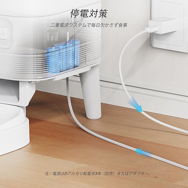 【二重電源 停電対策】えさやり器自動は5V ACアダプターと単三電池4本バックアップシステムで駆動します(電池は付属しません)。停電しても給餌を中断することなく電池で動作し続けるので、万が一の緊急時にも安心してご使用いただけます。メモリー機能があり、突然の停電でもタイマーが無効になることはありません。あらゆる種類のペットための多用途な解決策です。