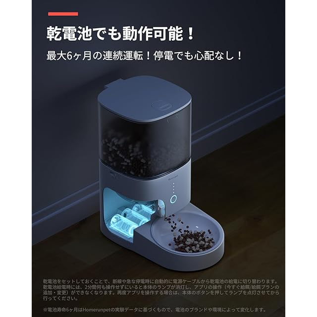 停電でも心配なし、2種類の給電方式: 電源ケーブルのほか、自動餌やり機 独自の省エネ設計の乾電池モードもそなえ、単一4本のアルカリ乾電池4本(別売)で最大6ヶ月作動します。停電時でも設定したスケジュール通りに給餌され、空腹で悲しい想いをさせる心配はありません。 ※電池寿命6ヶ月はHomerunpetの実験データに基づくもので、電池のブランドや環境によって変化します。