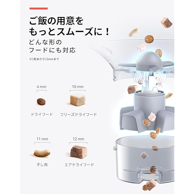 詰まらずスムーズな給餌: 3段階の詰まり防止設計で、さまざまのサイズのフードも排出。ペットの健康管理に適したフードを組み合わせることができます。 フィーダー開発時の連続225時間にもおよぶ過酷なテストにおいて、一度もフードが詰まることなくクリアしました。