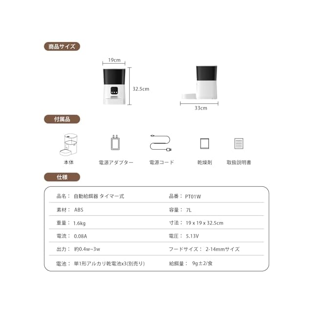 【7L大容量で安心】給餌器は7Lの大容量で、成犬や成猫を飼っている場合でも十分な量を供給できます。残業や短期出張、旅行、朝寝坊の際にもペットの食事を心配せずに生活を楽しむことができます。